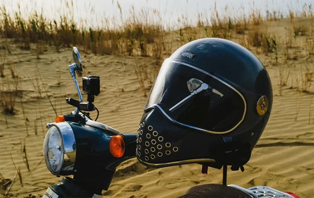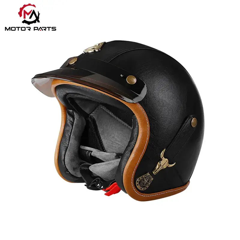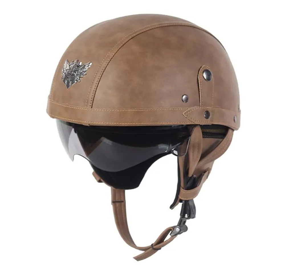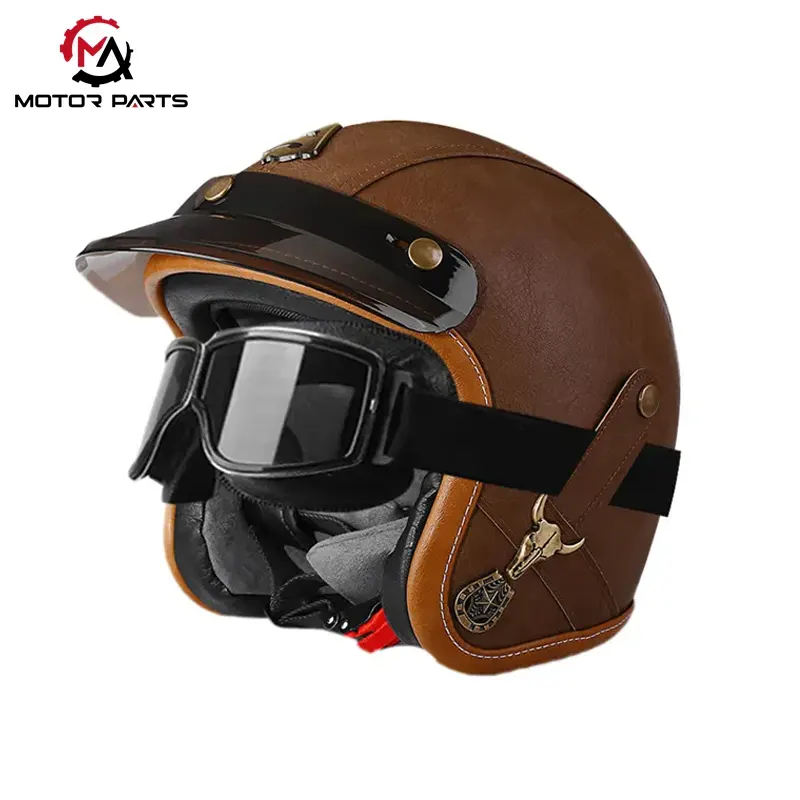 موٹرسائیکل ہاف فیس ہیلمٹ لیدر ود گوگلز کلاسک فلائٹ ہیلمٹ سے متاثر ہے، جس میں چمڑے کی ساخت کو دھاتی بکسوں کے ساتھ ملا کر 1960 کی دہائی کے ریٹرو رائیڈنگ اسٹائل کو دوبارہ بنایا گیا ہے۔ عملی ضروریات کو پورا کرتے ہوئے، یہ شہری سواری اور اسٹریٹ کلچر میں ایک بصری خاصیت بھی بن جاتا ہے، جو ریٹرو موٹر سائیکلوں، کروزروں، اور ذاتی نوعیت کے تبدیل شدہ ماڈلز کے لیے موزوں ہے۔