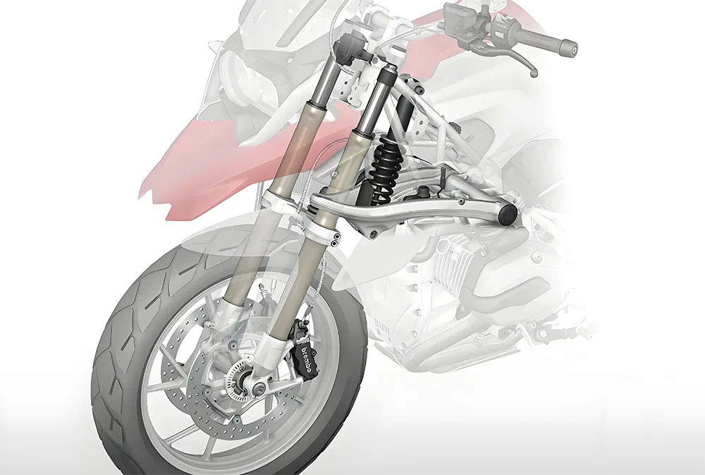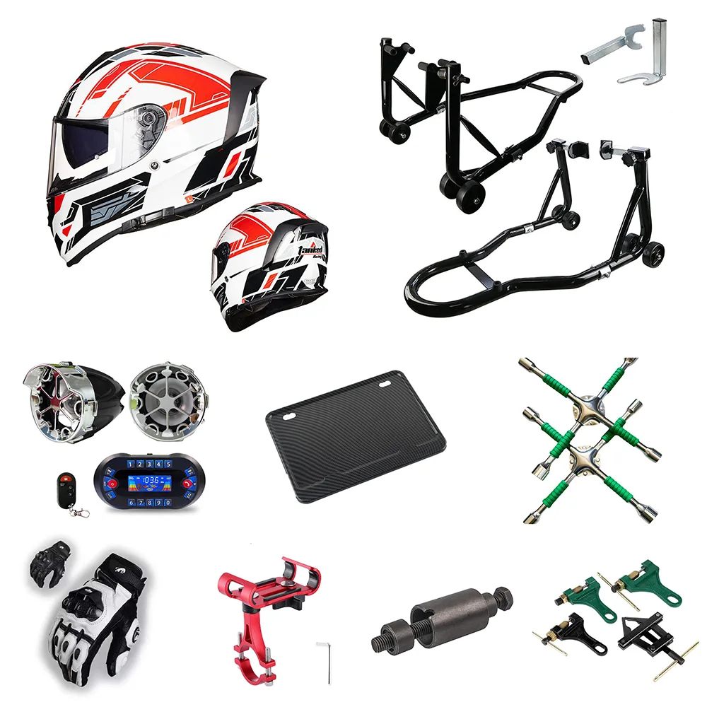 This is your motorcycle’s skeleton and suspension. It starts with the frame and fender. The front fork and suspension system (including shock absorber components) handle bumps. Your connection to the road is through the wheel, hub, wheel rim, and tire. The functional and protective accessories, e.g. اینٹی چوری لاک ، بمپر/کریش پروٹیکشن ، ریرویو آئینے ، اسٹوریج باکس ، گارڈ فریم (انجن گارڈز/کریش بارز) ، کک اسٹینڈ ، اور ونڈشیلڈ ، یہاں تک کہ آرائشی لوازمات جو چیسیس فٹ ہیں۔